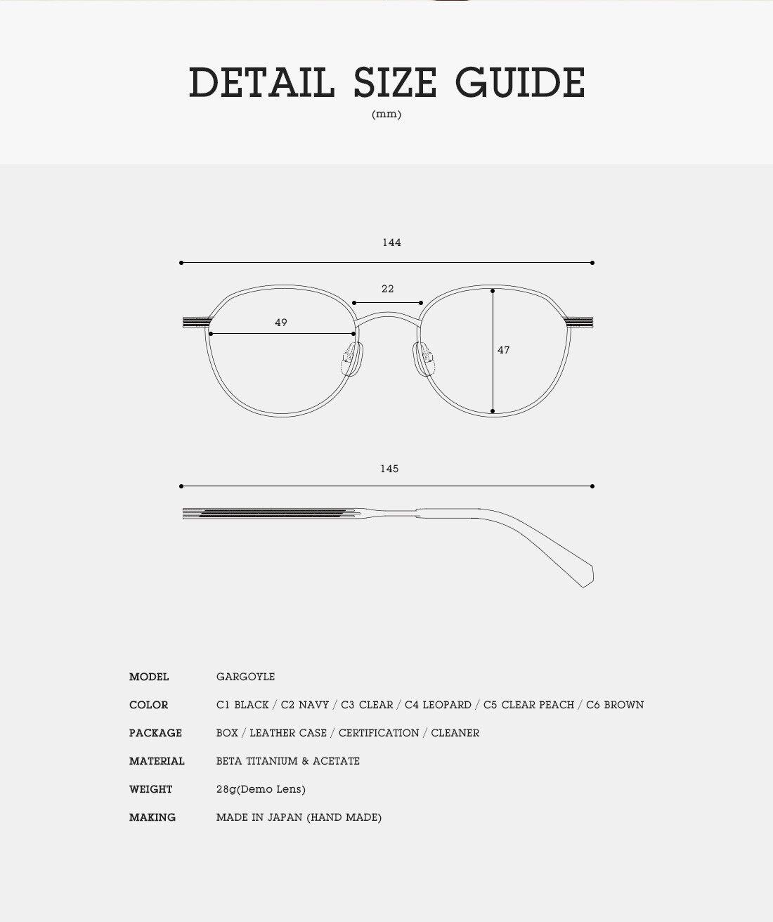 FRAME: front 144 mm / side 145 mm / bridge 22 mm